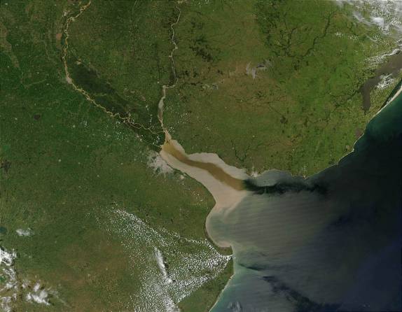 A imensa foz do Rio da Prata. Pode-se ver claramente a cidade de Buenos Aires, ao sul do rio, além do rio Uruguai, que delineia a fronteira desse país, e o rio Paraná, que traz as águas de Minas, São Paulo, Paraná e até do Pantanal (através do rio Paraguai)